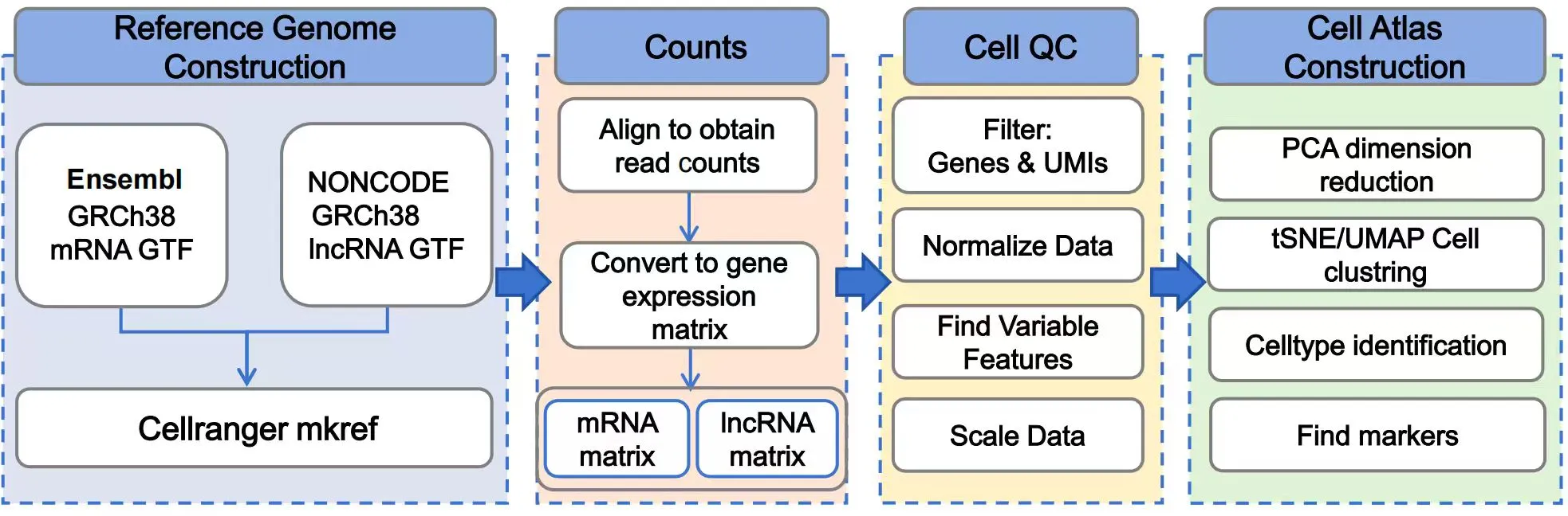 Table 1 Data overview of single-cell datasets Data analysis workflowSince our analysis focuses on long non-coding RNAs, we first downloaded the Gene Transfer Format(GTF) file of lncRNA from the NONCODE v6 database, and merged it with the GTF file of mRNA from the hg38 reference dataset to construct a GTF file containing both lncRNAs and mRNA. After obtaining the GTF file, we used the Cell Ranger v8.0.1 software, which is specifically designed for the 10x Genomics platform, to process the data and generate gene expression matrices (UMI counts). We then used the Seurat v5.1.0 package for cell quality control, normalization, principal component analysis (PCA) dimension reduction, and clustering based on personalized principal component numbers and clustering resolution using tSNE and UMAP.